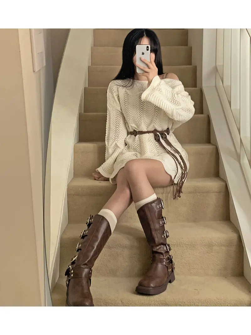 Asymmetrical Shoulder Design Dress with Belt, Loose Fit Versatile Skirt for Women