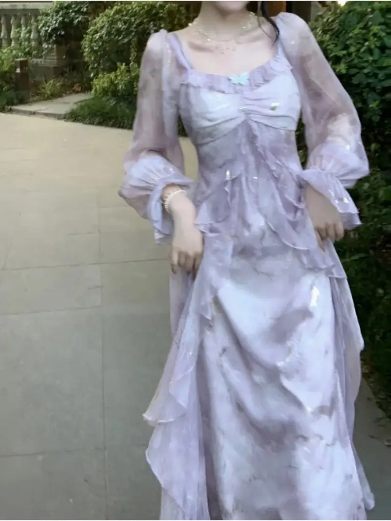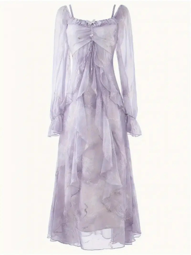 Elegant Gray-Blue Ombre Ruffled Long Sleeve Dress with Princess Sleeves & Square Neckline - Bodycon Floor-Length Summer Dress for Women, Machine Washable