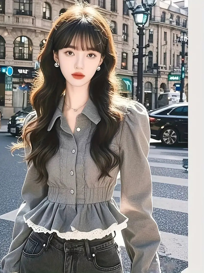 Elegant Long Sleeve Blouse with Lace Trim & Button Details - Versatile Ruffle Trim Top, Solid Color, All-Season Wear for Women, Versatile Fashion | Ruffle Trim Top | Classic Collar Blouse