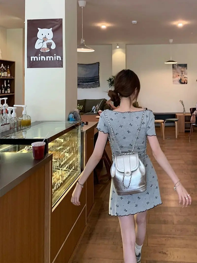 Fit, Casual Chic | Light Blue Floral Print Mini Dress with Decorative Bow & High Neckline | Women'S Fashion | No Belt, Short Sleeve | Adult Size | Perfect for Casual Attire, Summer Casual Wear | Chic Mini Dress | Stylish Ruffle Detail