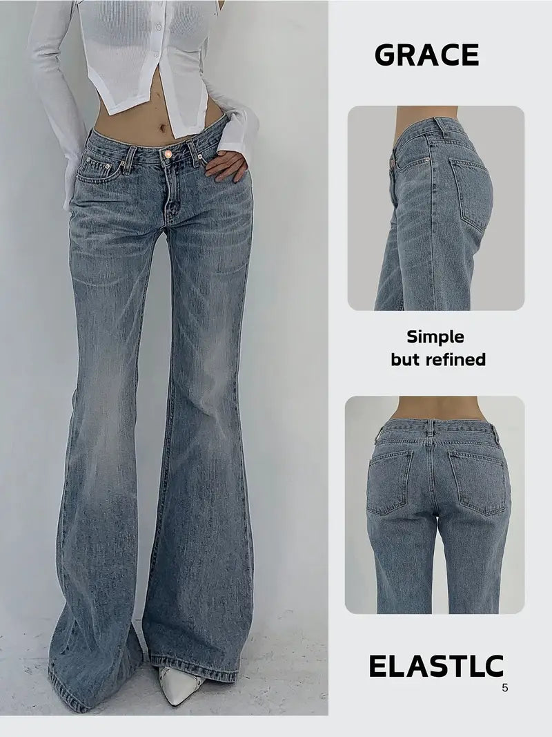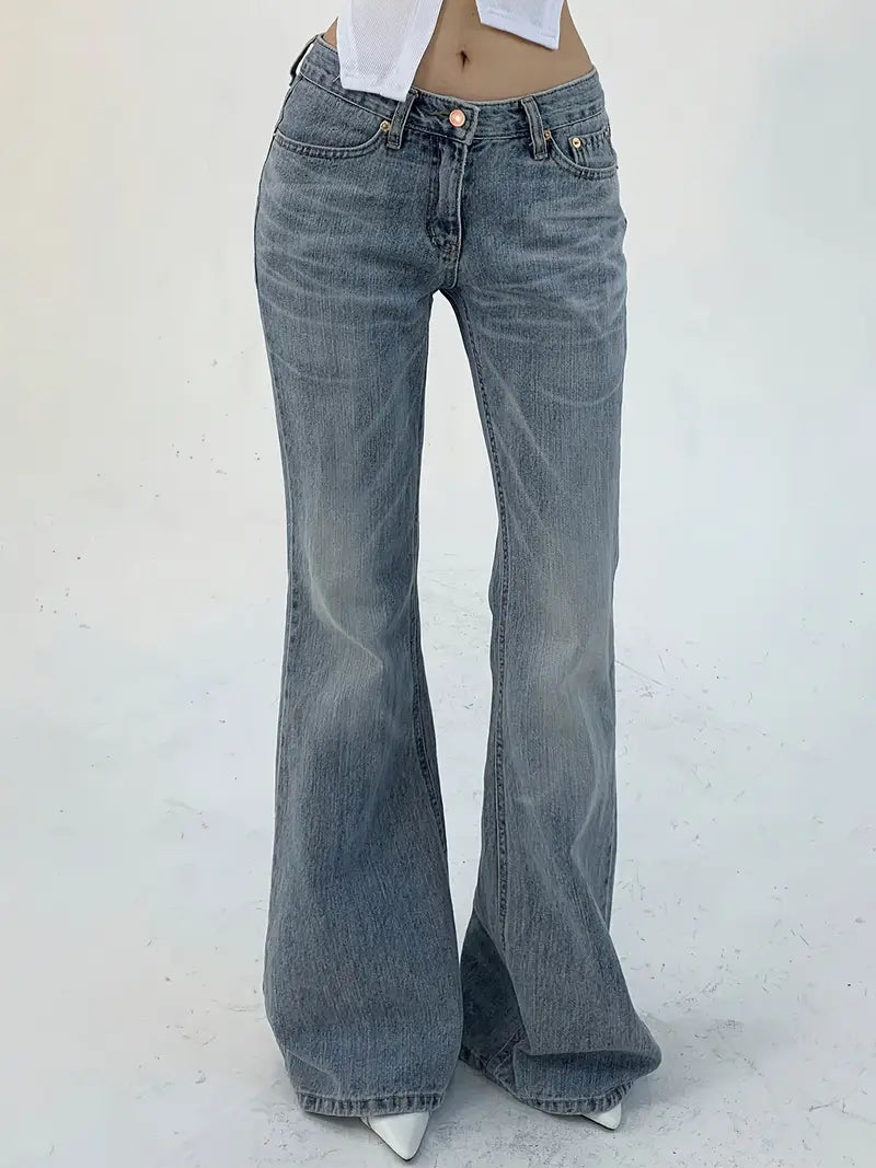 Women'S Elegant Stretch Denim Flare Jeans - Slim Fit Low-Rise Wide-Leg Pants with Pockets, Zipper Closure & Button Detail, Light Blue Washed Finish for Spring Summer Fall Casual & Evening Outfits, Seasonal Fashion, Medium Elasticity