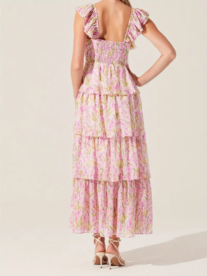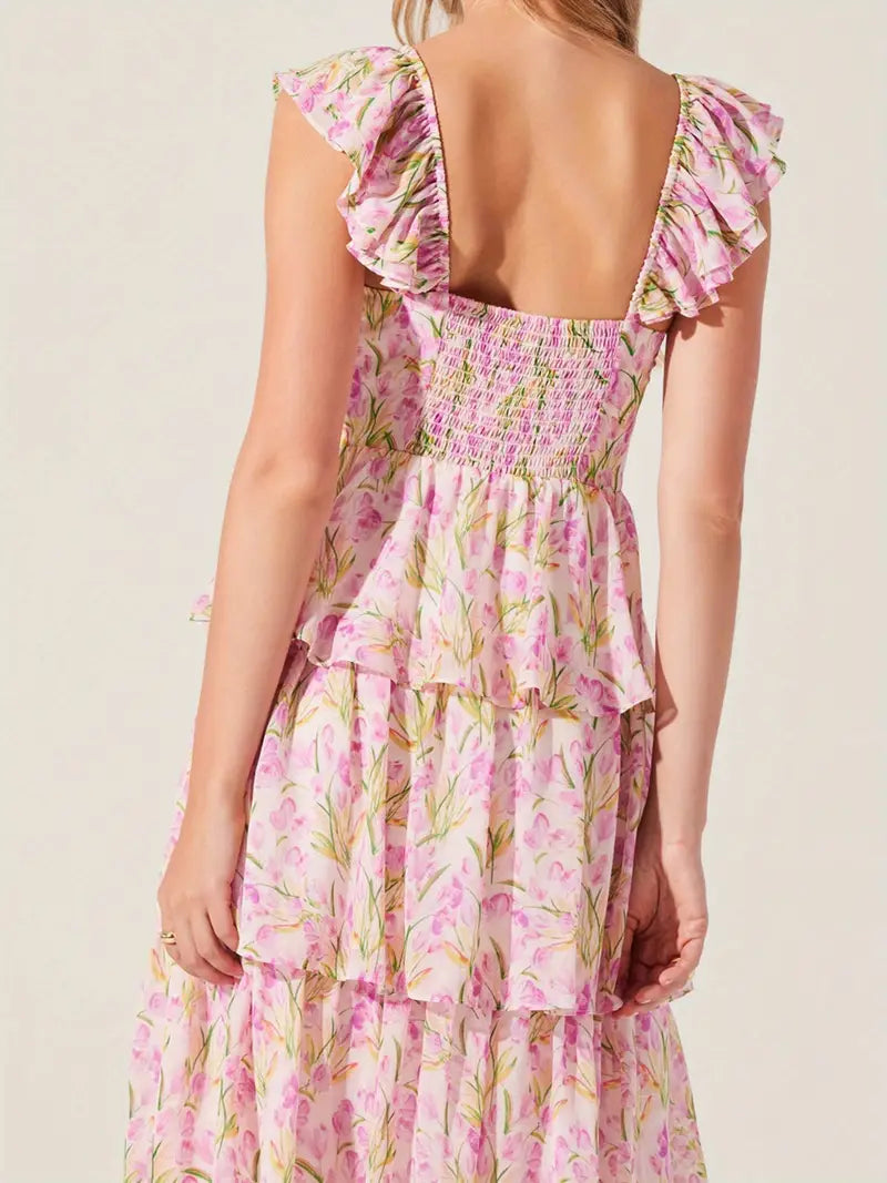 Women'S Floral Dress Stylish Multi-Layered Ruffles Split Cap Sleeve Long A-Line Dress for Spring Summer