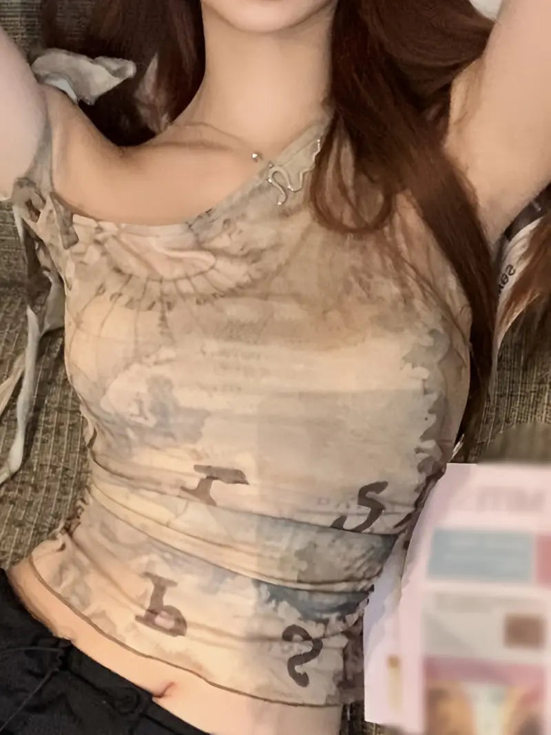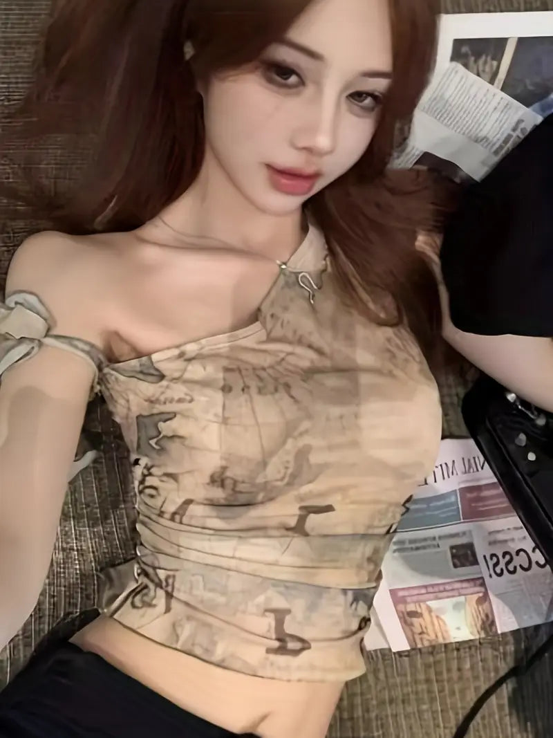 Women's One Shoulder Tank Tops Graffiti Print Sleeveless Strappy Ruched Vest Streetwear